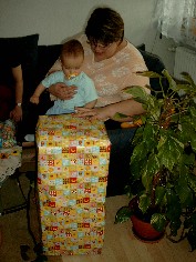 Mami hilft beim Auspacken. Uroma und Tante Sarah schauen zu.