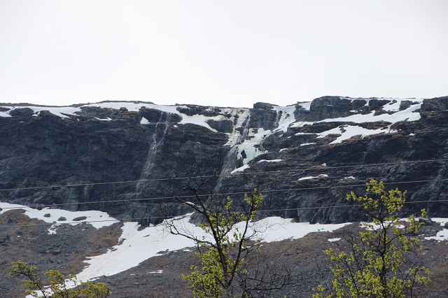 Ende Juni, 9°C, rechts eingefrorene Wasserfälle links der neue.