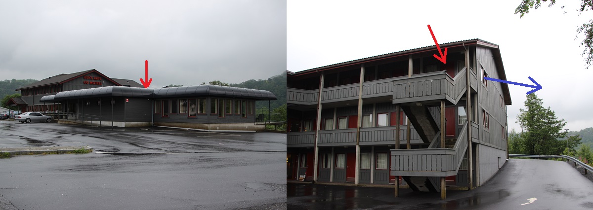 Roter Pfeil Zimmer 124, blauer Pfeil unser Blick zum See.