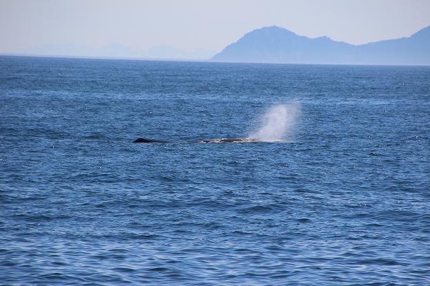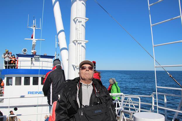Da Militärschiffe in den letzten Tagen mit ihrem Sonar die Wale in der Gegend gestört hatten, mussten wir sehr weit rausfahren (ca.35km). Da wir immer noch blauen Himmel und Sonnenschein hatten, stimmt Klaus Prognose: "Wenn in Deuschtland Sch**** Wetter ist - ist hier oben gutes Wetter". In diesem Sinne - wir hoffen, dass es hier so bleibt ;o)