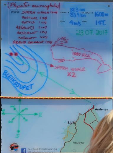 Auch beim Frühstück hatten wir schon blauen Himmel. Pünktlich um 9:30 Uhr befanden wir uns im Walsafari-Museum. Hier wurde zunächst einiges über Wale erklärt. Anschließend begaben sich alle zum Hafen um auf die "Reine" zu gehen, wo wir pünktlich um 11 Uhr abgelegt haben.