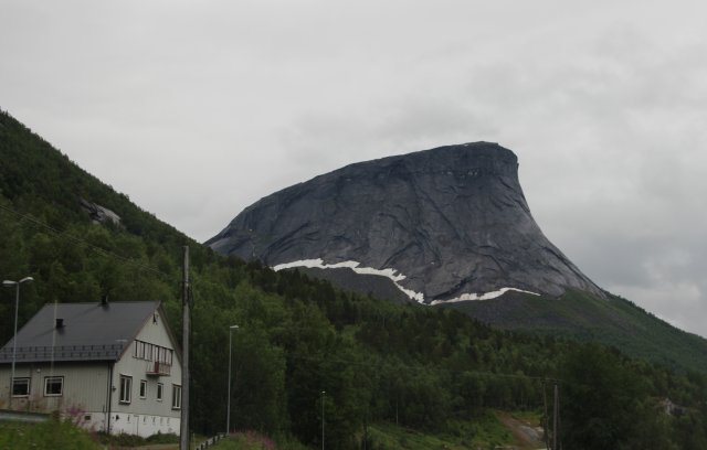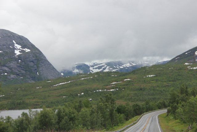 Heute hat es nicht mehr geregnet, trotzdem haben wir auf unserem Weg auf der E6 Richtung Süden bis Mo i Rana zahlreiche Tunnel passiert. Auf dem Weg dahin in Fauske nochmal Gas nachgetankt. Danach sind wir über die Hochebene des Saltfjellet gefahren und haben große Schneeflecken bei 8°C gesehen, die noch nicht abgetaut waren.