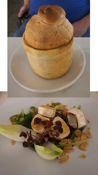 Klaus: Pilzsuppe im Brot serviert - Daniel: Rote Bete Salat mit Schafskäse.