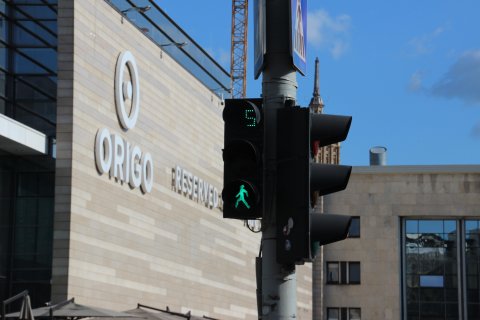 Die Fußgängerampeln in Riga zeigen oben die Zeit an, bis zum Umspringen auf Rot.