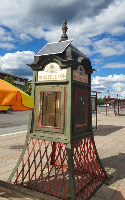 Das "Rikstelefon" mit Solarzelle vor dem Bahnhof in Boden.