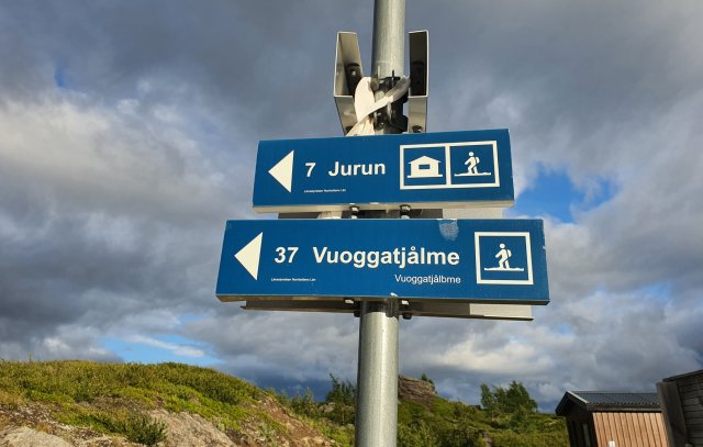 Die Schilder zum Wanderweg nach Vuoggatjalme Nahe der Grenze zu Norwegen.
