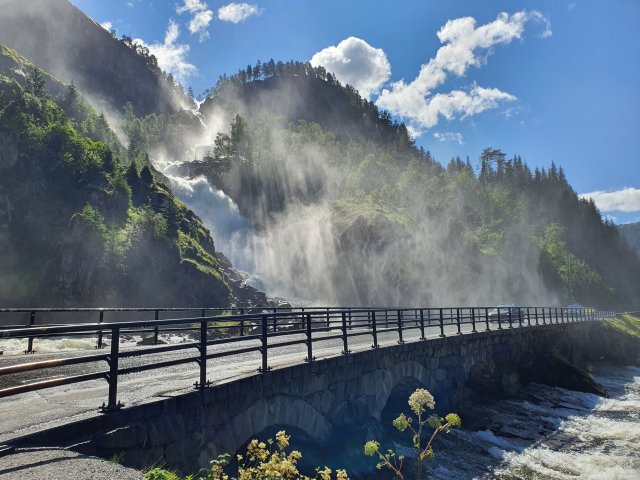 Der Latefossen mit seiner Gischt über die Straße...