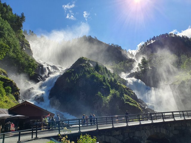 Nach dem Frühstück vom Buffet sind wir die E16 Richtung Süden gefahren. Kurz vor Vossvangen haben wir auf die 13 gewechselt. Diese sind wir ein langes Stück gefolgt, auch heute wieder Tunnel und Brücken passiert. Ein langes Stück am Fjord entlang. Am tollen Latefossen vorbei, kurz danach dann auf die E134 bis Haukeli. Ab da die 9 weiter nach Süden genutzt. In Hovden sind wir erst zu Mittag in die Fjellstoge eingekehr und haben danach ein Zimmer für die Nacht gebucht.