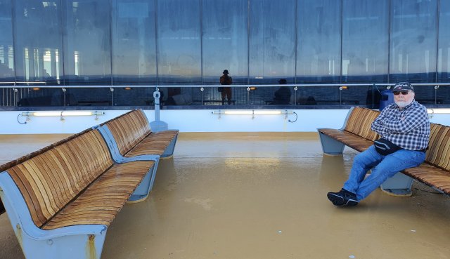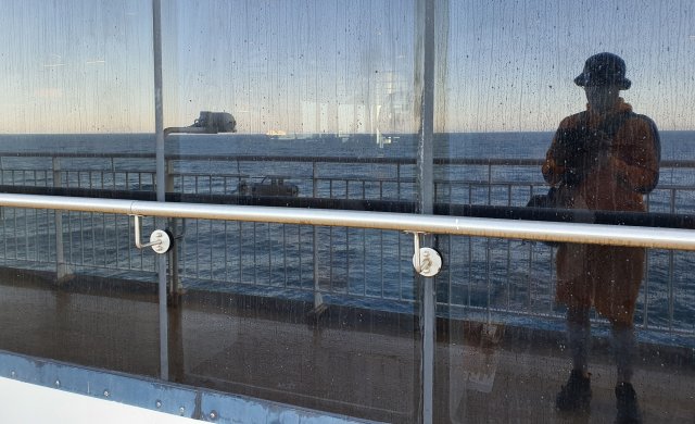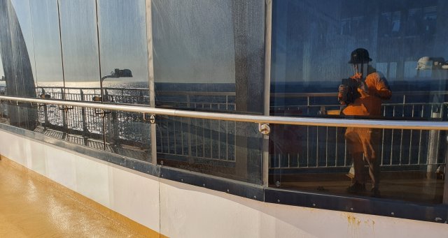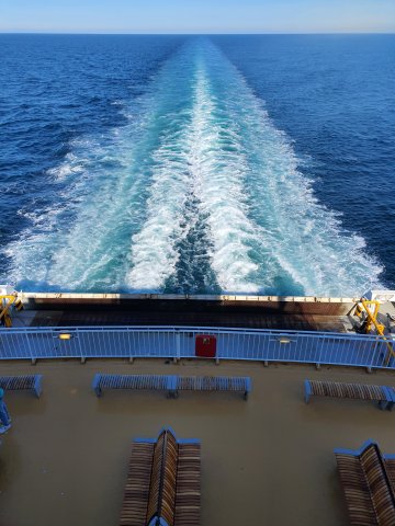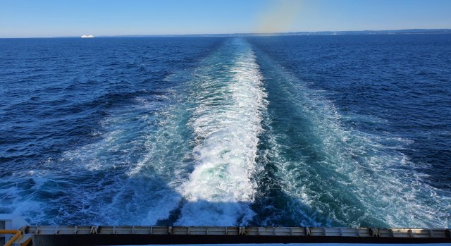Da die Fähre heute früh fährt und wir in diesem Hotel ohne Frühstück gebucht haben, sind wir nach dem Aufstehen direkt zu Fähre gefahren. Als die Fähre losfuhr, wurden die Restaurants an Bord geöffnet und wir haben erstmal gefrühstückt. Danach dann nach oben, draußen ans Deck, da hier die Aussicht am Besten ist. Einige Schiffe